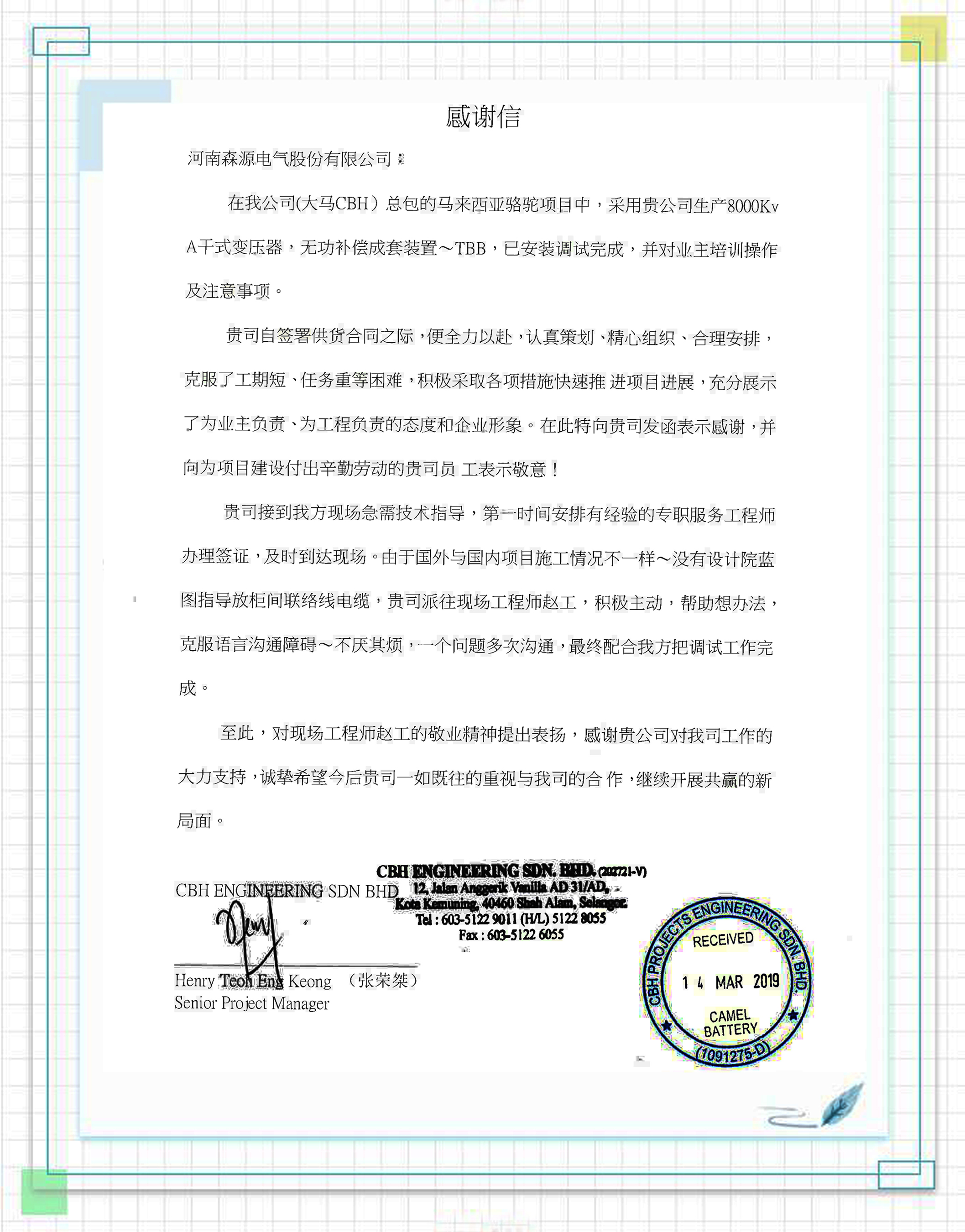 近日,一封来自马来西亚大马CBH公司的感谢信漂洋过海传到森源电气,森源提供的卓越产品和一流服务赢得了他们由衷的赞誉。