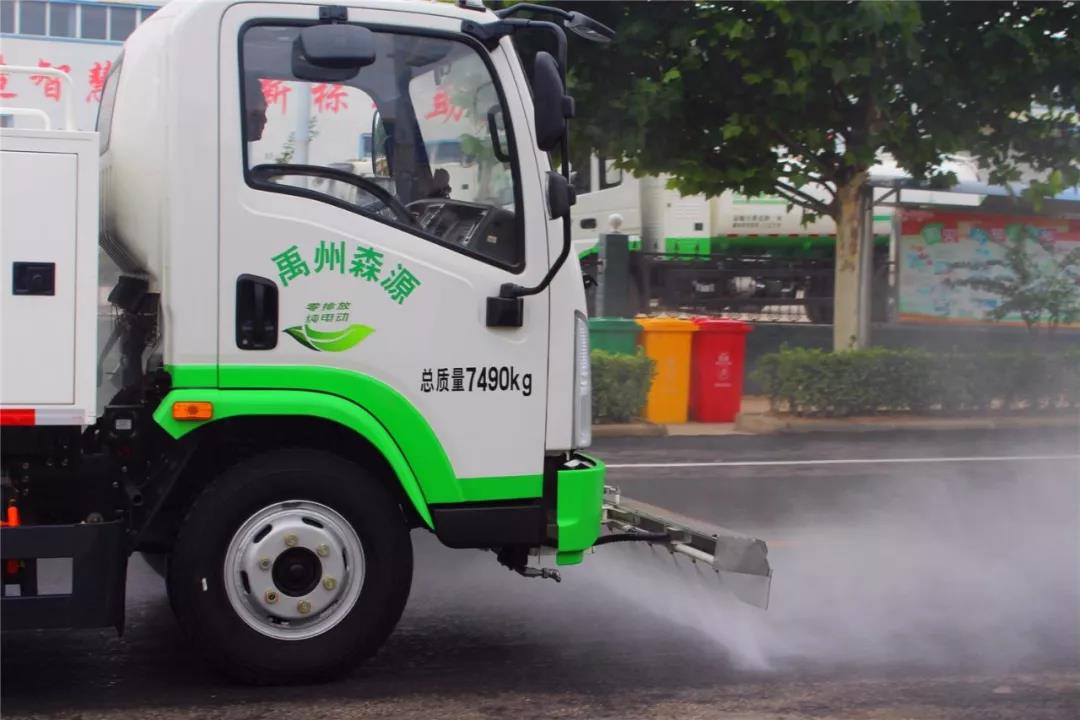 正在工作中的森源环卫车辆及作业后的玉泉村街道,森源环卫服务效果令观摩团纷纷点赞。